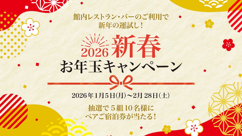 期間中、館内レストラン・バーにおいて、ランチ・喫茶・ディナーを、1会計10,000円(税・サ込)以上ご利用で、応募券を1枚進呈いたします。応募券に必要事項をご記入の上、1階ロビーに設置の応募箱にご投函いただくか、応募券に記載の二次元コードより必要事項をご登録の上、ご応募ください。抽選で5組10名様に、下記グループホテルのペアご宿泊券をプレゼントいたします。