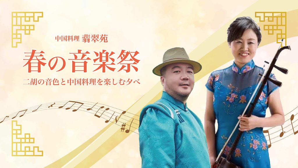 哀愁を感じさせる中国伝統楽器「二胡」に清澄な中国笛、ホーミーの倍音が交わり、深く、やさしく、時に切ない音色が、翡翠苑の空間を優雅に包み込みます。本格中国料理と生演奏が織りなす、一夜限りの特別な音楽祭を、どうぞ心ゆくまでお楽しみください。