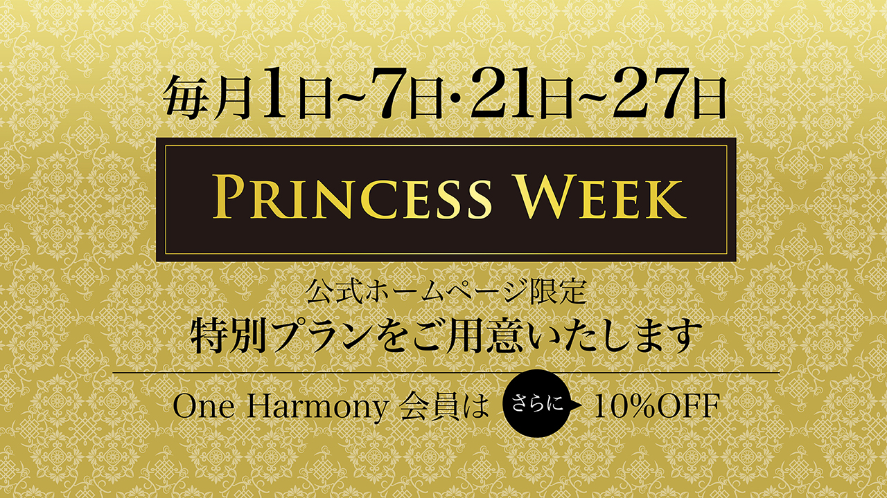 公式ホームページ限定で、毎月1~7日・21~27日の「PRINCESS WEEK」だけに公開されるお得なプランや、その他お楽しみいただける嬉しいプランをご用意いたします!